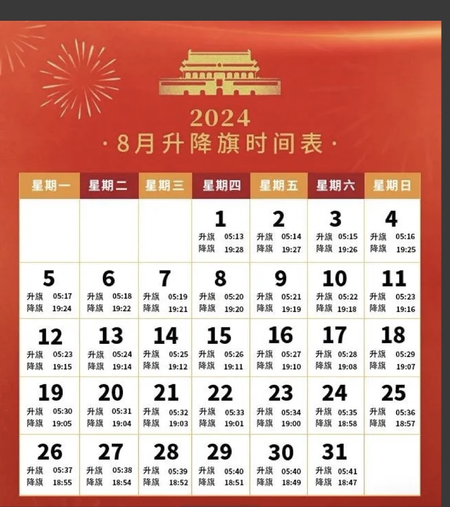 북경에서는 천안문광장에서 매일 해뜨기 전에 계양식(升旗仪式)을 한다. 그것도 격식에 맞추어 하기때문에 많은 사람들이 흥미를 가지고 관람을 한다.