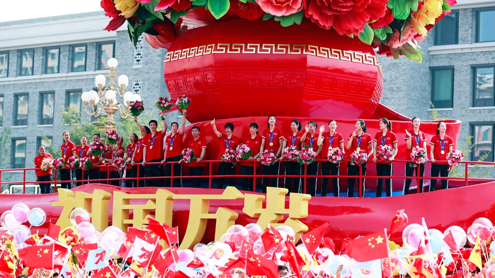 이날 천안문광장은 꽃으로 뒤덮였고 열병식을 참관하려는 인파로 뒤덮였다.