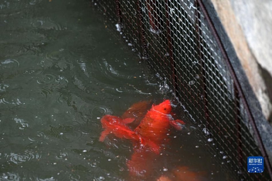 빗물이 가득 찬 고궁의 금수강金水河에서 잉어가 헤엄을 치고 있다.