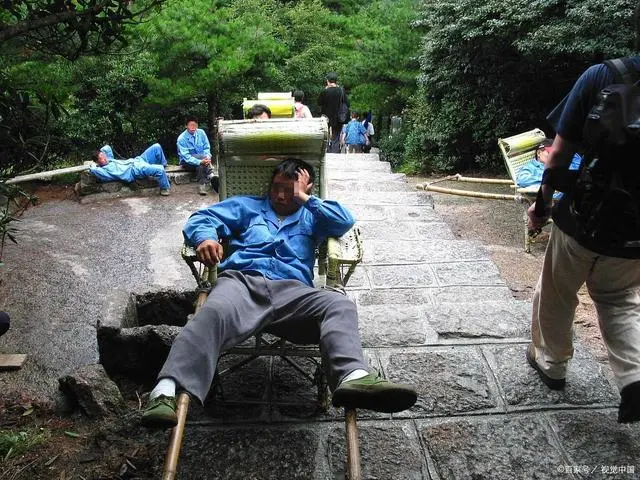 이렇게 중국은 높은 산을 짐을 지고 오르는 짐꾼이나 힘들어 하는 등산객들을 가마에 태워 올려주고 돈을 버는 짐꾼이 많이 있다.