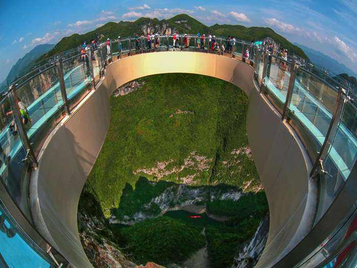 전면 유리로 만들어져 바닥과 가드레일이 모두 뚫려 있고 발 아래 700여m 깊이의 무가림 협곡이 있다.