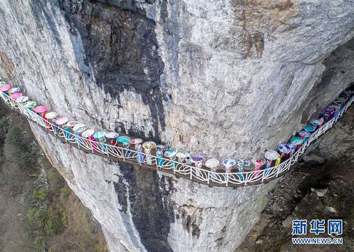 지난 3월 26일 충칭시(重庆市) 난촨구(南川区) 진퍼산(金佛山)풍경구에 위치한 높이 2천여미터 절벽에 걸려있는 유리잔도에서 70여명의 치파오(旗袍)애호가들이 '치파오쇼'를 벌이며 중화 치파오의 아름다움과 매력을 선보였다.