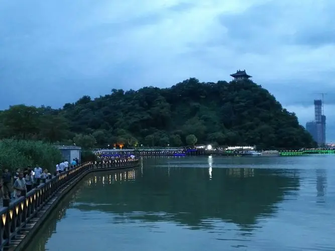 산꼭대기에 올라 동쪽에서 자오산(焦山)을 바라보고 서쪽에서 진산(金山)을 바라보며 강을 사이에 두고 양저우(扬州) 평산당(平山堂)이 선명하게 보인다.