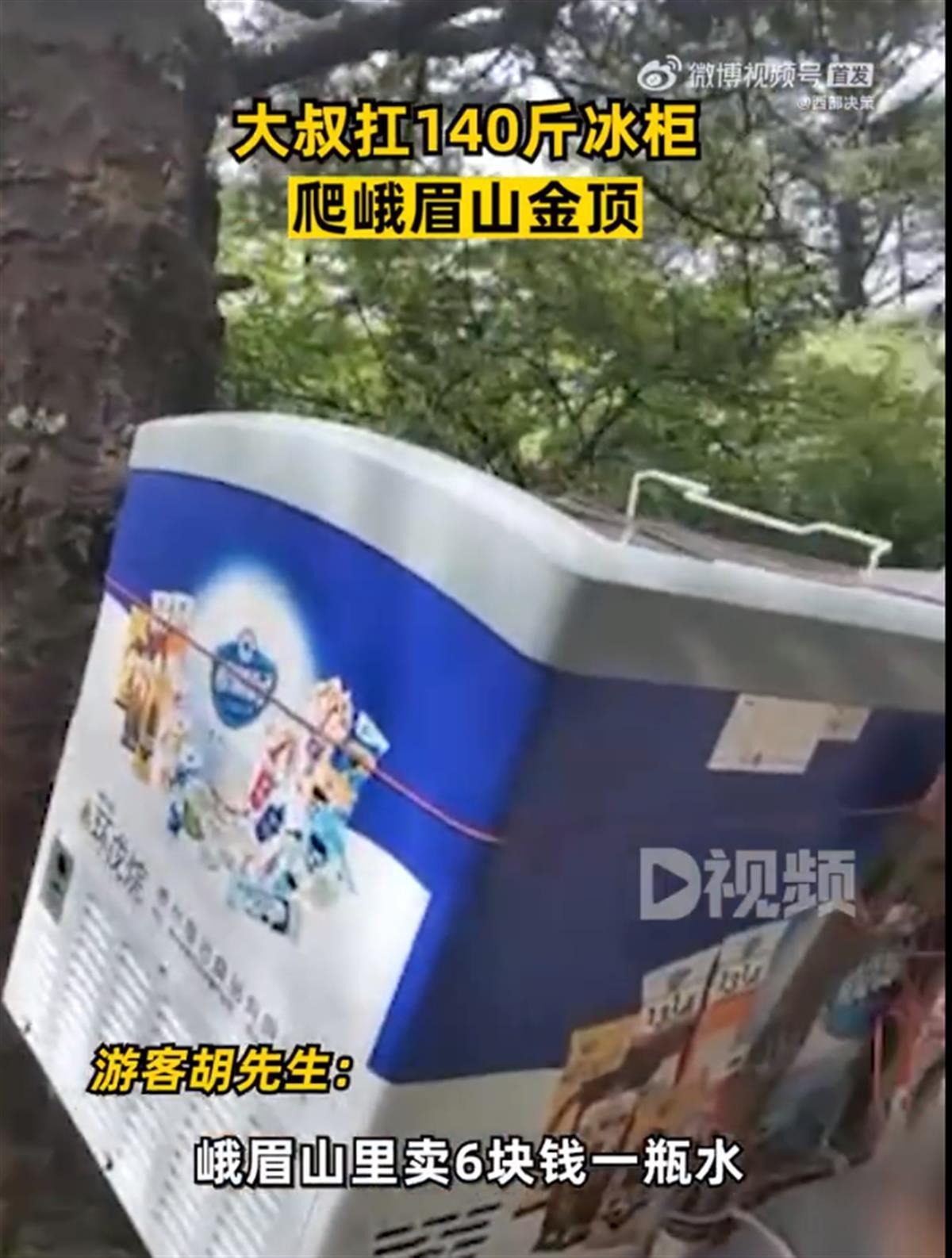 쓰촨성 러산(樂山) 아미산의 한 사람은 140근( 70kg)의 냉동고를 메고 2시간 동안 산꼭대기에 올라가 팔고 있다.