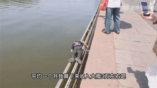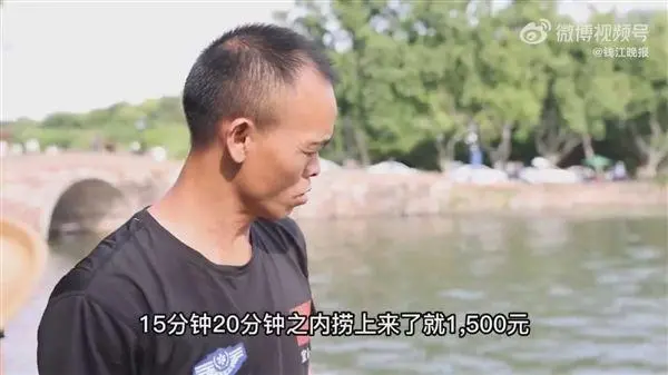 한 남자가 항저우의 서호(西湖 시후)에서 휴대전화 등의 중요물건을 건지는 고 위험 직업으로 하루 약 1만위안의 수입을 올리고 있다.