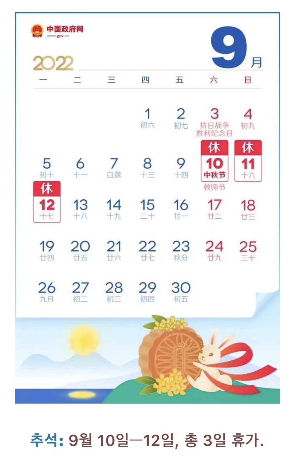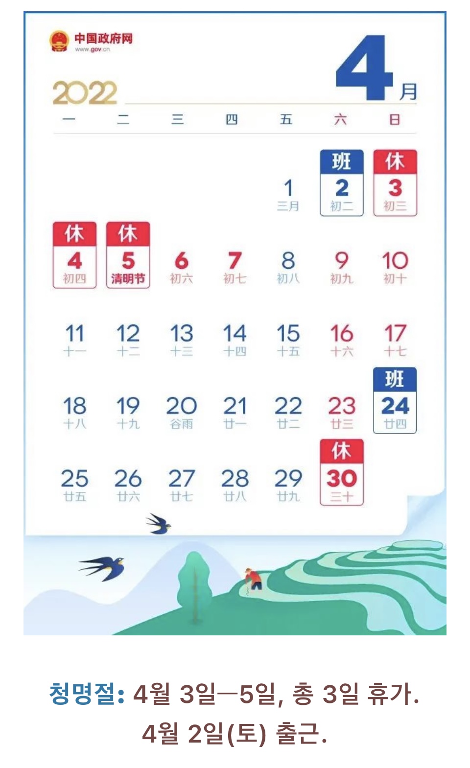 2022년도 중국의 휴무일 공고