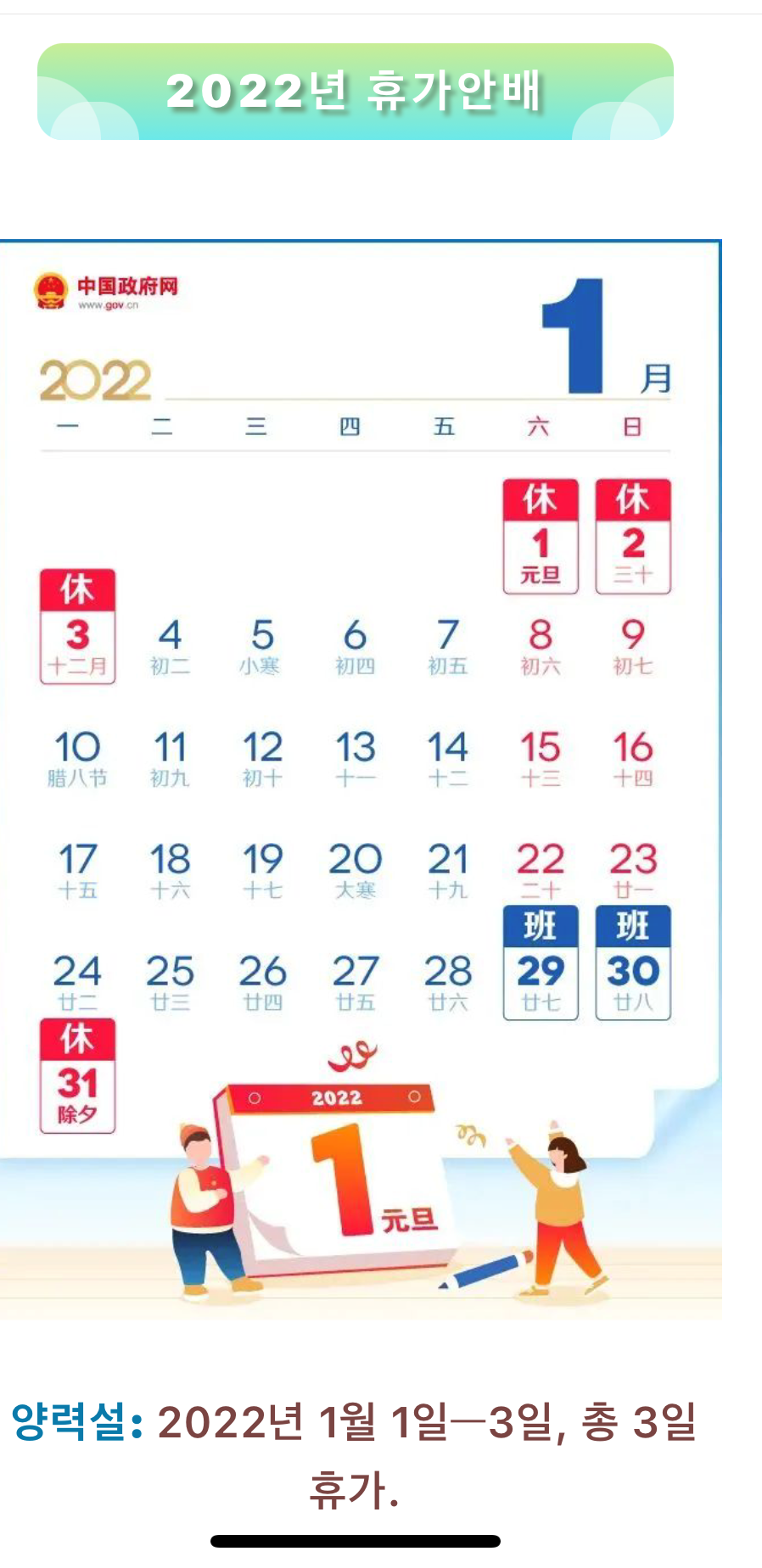 새로운 한해를 한해를 맞이하면서 중국정부에서는 2022년도의 휴가일을 공고했다.