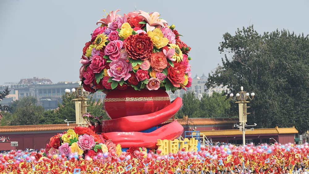 이날 천안문광장은 꽃으로 뒤덮였고 열병식을 참관하려는 인파로 뒤덮였다.