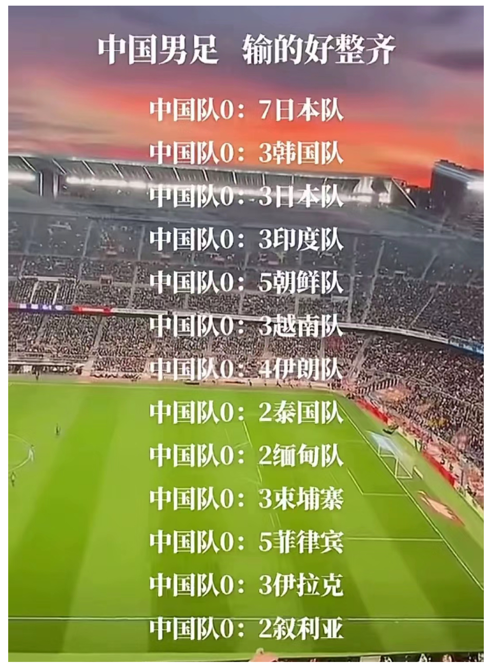 일본과의 대전에서 무려 7:0으로 패하자 중국의 14억 인구가 모두 중국 축구를 비난하고 각종 SNS에서는 온갖 욕설과 비난으로 도배되고있다.