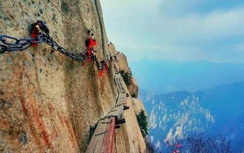 잔도 위 아래로 절벽이 우뚝 솟아 있고, 철삭이 가로로 늘어져 있고, 돌로 만든 길바닥을 돌 기둥으로 고정되어 있고, 유객이 여기까지 와서는 벽에 배를 대고 숨을 죽이고 걸음을 옮기는 것이 '화산(華山)'이라고 한다.